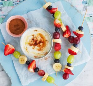 Rainbow Fruit Kabobs with yogurt-chia dip
